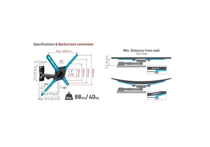 Piemērots stiprinājumiem līdz 400X400mm (VESA un Non VESA).