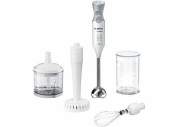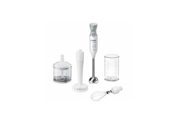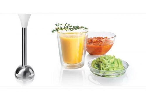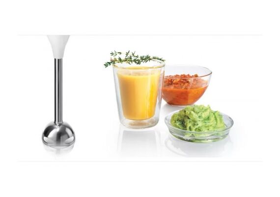 Komplektā 2 x Vāks, 1 x Miksera /maisīšanas trauks, 1 x Miksera stienis, nerūsošā tērauda, 1 x Izspiedējs, 1 x Putošanas slotiņa, 1 x Universālais smalcinātājs