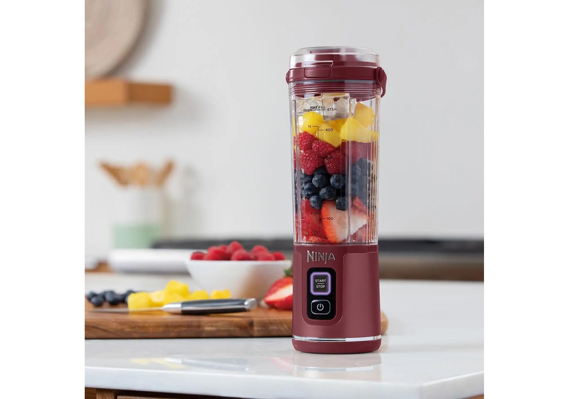 | Komplektā | • Bezvadu un pārnēsājams; • Uzlāde ar USB-C; • Mazgājams trauku mazgājamajā mašīnā vāks un krūze (augšējā plauktā); • Komplektā: motora pamatne, USB-C lādētājs, 530 ml krūze (maksimālā ietilpība 470 ml), necaurlaidīgs vāciņš dzeršanai, asmens aizsargs un krūzes vāks. |