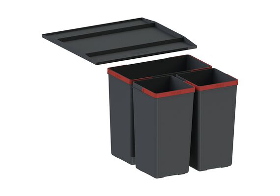 | Papildu informācija | Šķirošanas sistēma 45 cm skapim. Tilpums: 14,5L + 2x 7,5L. Ievietojas atvilktnē. Izgatavots no pārstrādātas plastmasas. Izturīgs rokturis notur līdz 18 kg. Antiseptisks materiāls neļauj vairoties 99% baktēriju. Pretslīdes spilventiņi. |
