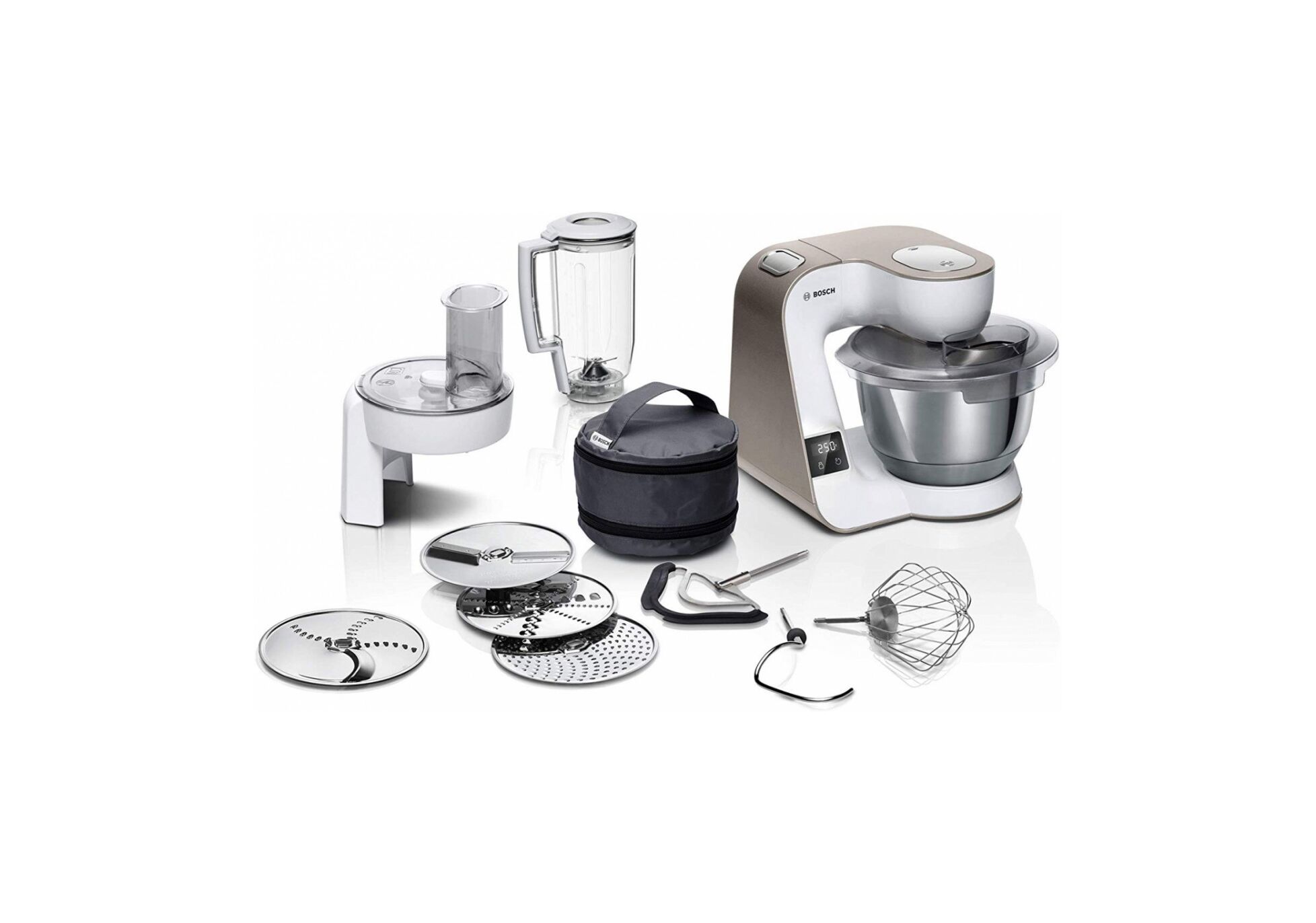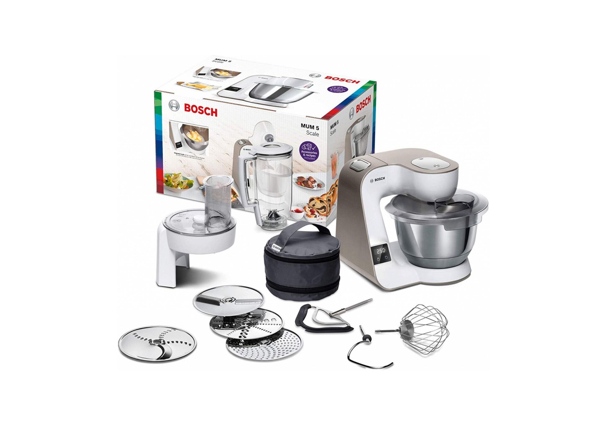 Komplektā 1 x Vāks, 1 x Griežamā mašīna ar bīdītāju, 1 x Nerūsošā tērauda putošanas bļoda, 1 x Metāla mīklas āķis, 1 x Miksera uzgalis, plastmasas, 1 x Skaidiņu ripa, 1 x Rīves ripa, vidējā, 1 x Griešanas un rīvēšanas ripa, 1 x Pagriežamā griezējripa, 1 x Piederumu soma tumši pelēks