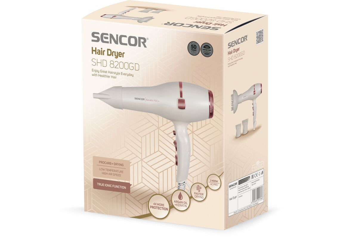 | Papildu informācija | Izbaudiet lielisku matu frizūru ik dienu ar veselīgiem matiem Profesionāls maiņstrāvas motors 3 temperatūras izvēles 2 ātrumi, lauj ātri izžāvēt matus ( 33% ātrāk matu žāvēšana) Samazina statisko elektrību Novērš matu bojāšanos Ergonomiskais rokturis nodrošina ērtu lietošanu gan ar labo roju, gan kreiso roku Noņemas aizmugurējais vāks vieglākai tīrīšanai Drošs pret pārkaršanu. Aksesuāri: Uzgaļi matu žāvēšanai un formēšanai un apjoma palielināšanai. |
