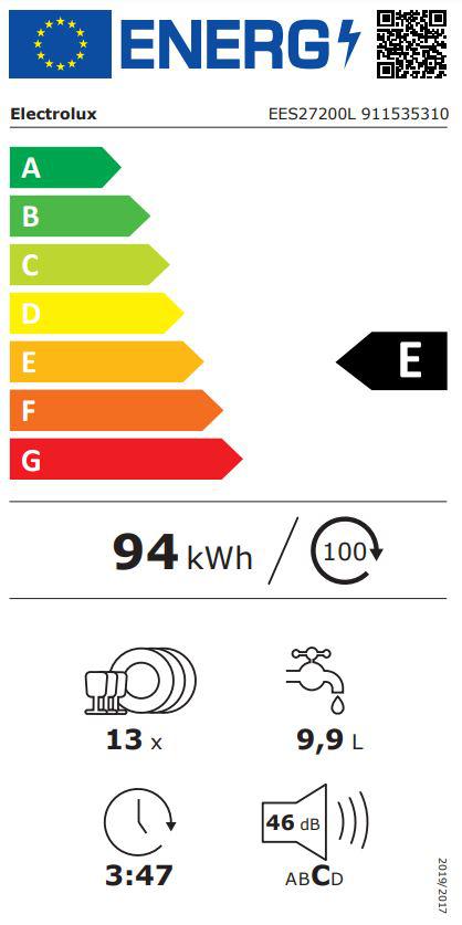 Потребление электроэнергии в 100 моющих циклах (2021) (посудомоечную машины) 94 kWh